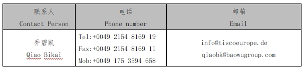 4.山西太鋼不銹鋼股份有限公司太鋼歐洲有限責任公司主要承擔歐洲市場太鋼鋼材產品的銷售,相關聯系人信息如下: