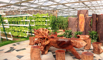 綠園占地3300余平米。按照尖頂連棟溫室設計建造,無論酷暑亦或嚴寒,室內均陽光充沛、清新自在、舒適宜人。園內種植多種營養果蔬和觀賞性植物,您可于游園中,親手采摘品嘗各種綠色有機無公害果蔬,享受摘蔬菜、品時鮮、邊采邊吃的田園樂趣,也可定置專屬于您的健康美食,園內四季恒溫、恒濕,可供30人同時用餐。綠園秉承貼近自然、生態回歸的造園理念,以溪流水系將多元景點自然鋪展,漫步其間溪中游魚嬉戲,溪邊翠色欲滴,一幅綠在園中、人在景中的生態畫卷由此展開,全方位演繹了人與自然和諧相處的優質生活。