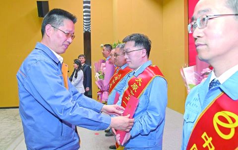 太鋼集團黨委書記、董事長吳小弟為受表彰者頒獎。 王旭宏 李俊杰 攝
