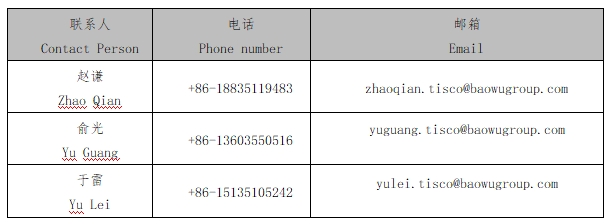 3.山西(xi)太(tai)鋼(gang)不(bu)銹鋼(gang)股(gu)份(fen)有(you)限公司(si)營銷(xiao)中心海外(wai)貿易部是本(ben)公司(si)產品出口(kou)的唯一官方渠道,相關聯系人信息(xi)如(ru)下(xia):